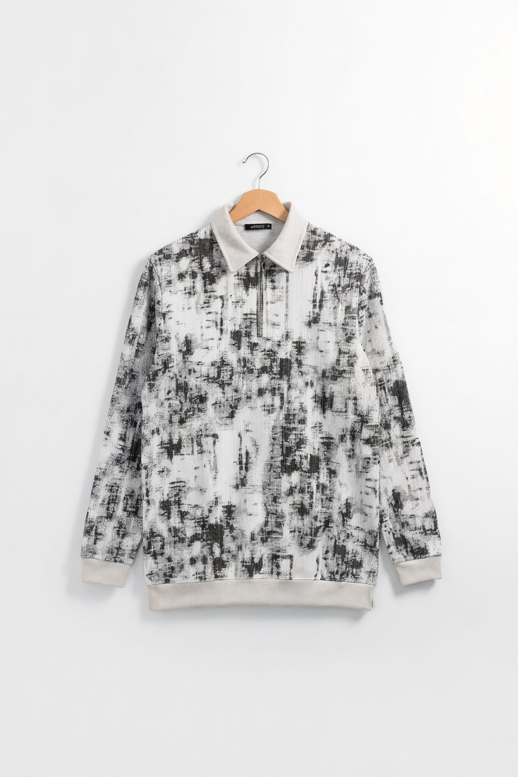 Make a statement with this uniquely designed pullover. Featuring a striking abstract brushstroke print in black over a rich White base, this piece is an effortless blend of wearable art and everyday comfort. The quarter-zip closure and classic polo collar keep the look refined, while the vibrant print ensures you stand out. Crafted from a soft, comfortable material, it’s the perfect choice for adding a bold, modern edge to your casual wear.